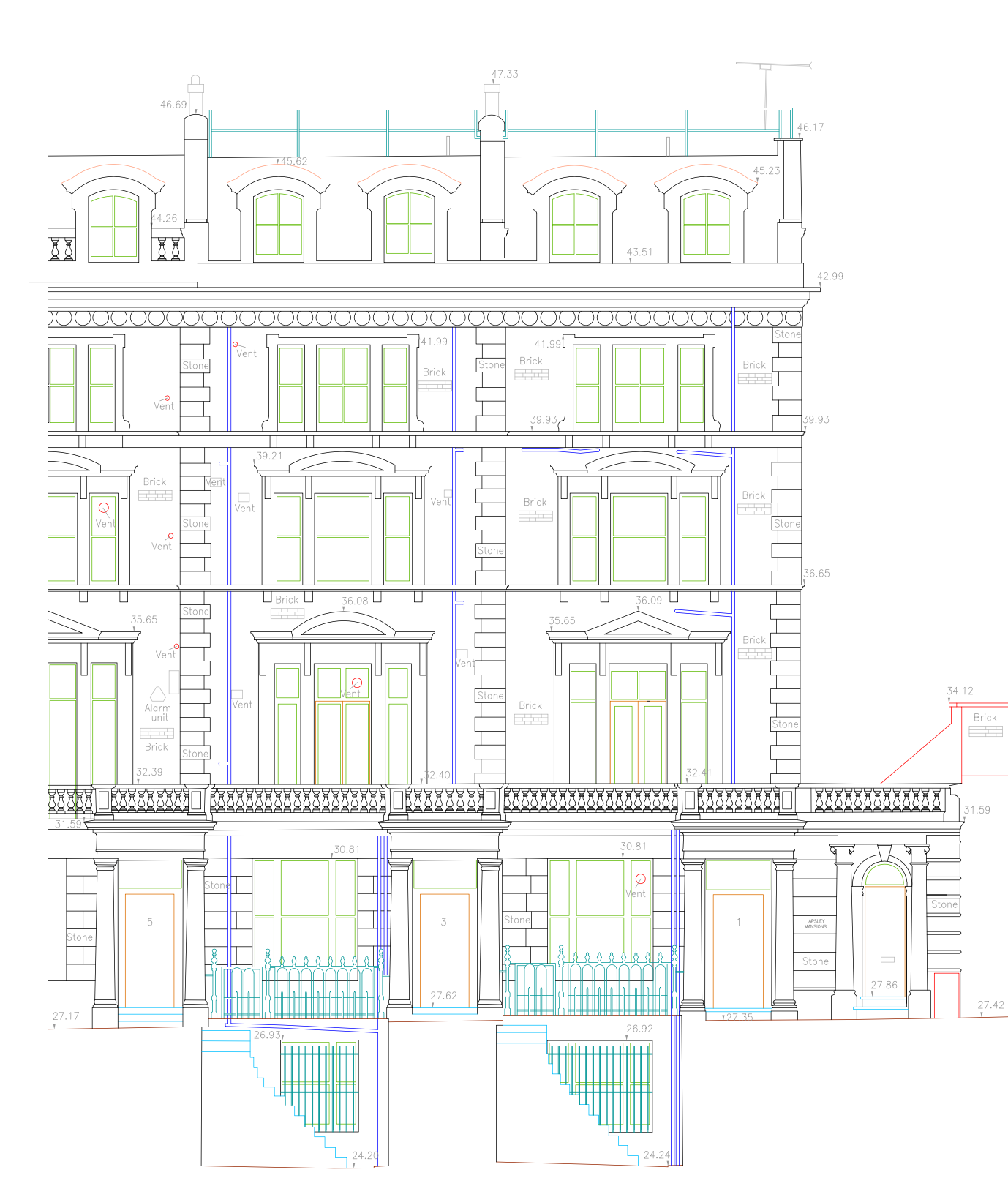 Existing elevation of a commercial site in London made in AutoCAD for a large scale refurb project.